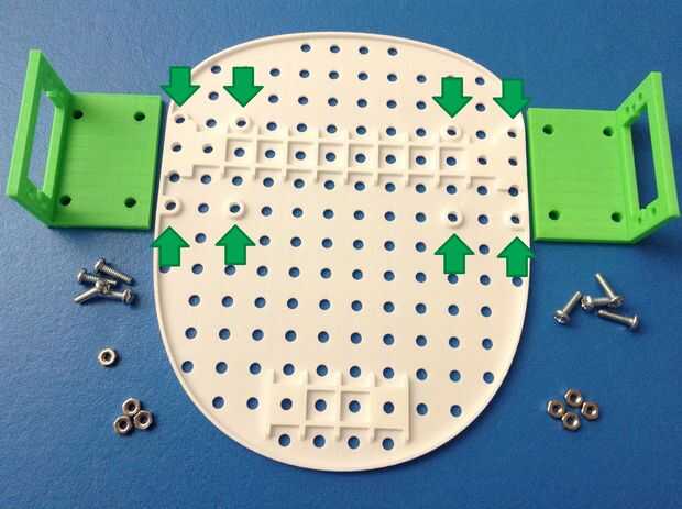 Lo primero que debemos hacer es colocar los soportes del Servo a la placa base. Usted puede ver la primera foto para ver donde usted quiere colocar los soportes del Servo