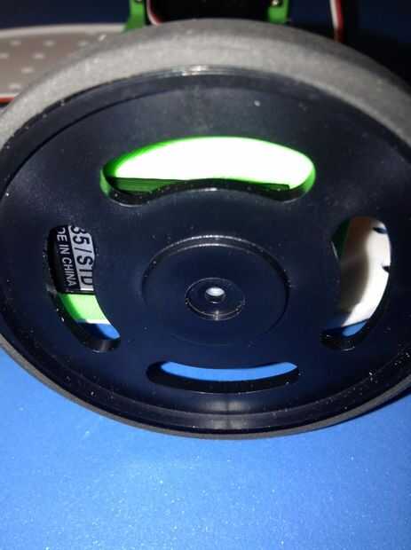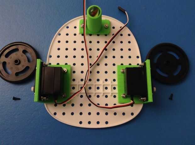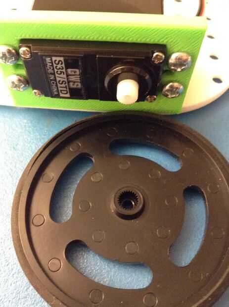 A continuación queremos colocar las ruedas a los servos. Debe tener un tornillo negro pequeño, usar esto para fijar la rueda al Servo.