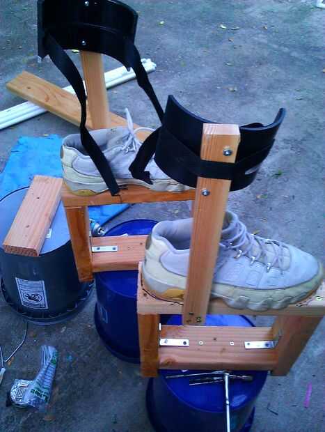 Para estar a la altura adecuada necesitaba un conjunto de pilotes, así que hice algunos con 2 x 4 y 2 x 6 para replicar los zancos de yeso. Hay un 2 x 6 en el centro de cada cubo y un 2 x 4 como un cojín del pie. Ortesis de pierna se actualizó más adelante en un 2 x 4 para más apoyo.
