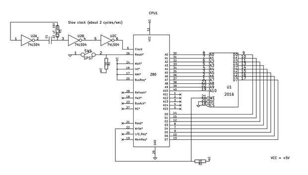 Tengo mi diseño de una variedad de recursos. Esta es una versión extremadamente simplificada que encontré después de mirar los kits en http://cpuville.com/computer_details.html y un correo electrónico a su creador. Él me guió y me mostró un diagrama del circuito simple arranque z80 que podría utilizar para aprender. También había estado leyendo del libro de Steve Ciarcia construir tu propio z80 inspirarte (está disponible en google libros gratis! ¡ Pruébelo!) . Utilizando su diseño básico también agregué algunos otros detalles (después de experimentación protoboard, que es paso 3: P) como un programador de memoria RAM y algunas pantallas.