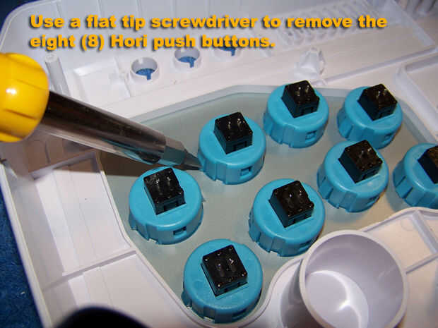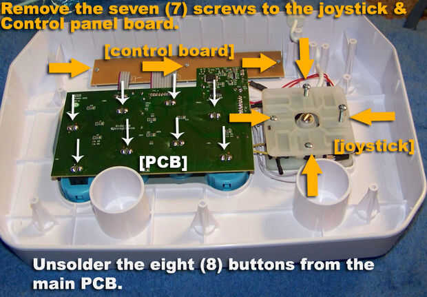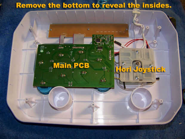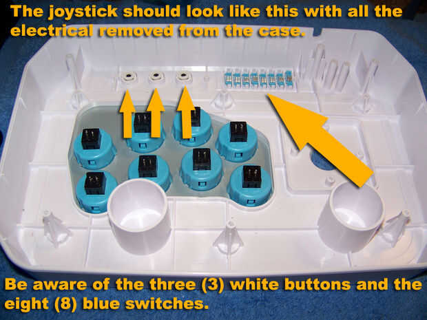 Desmontar el stick Arcade quitando todos los tornillos se puede encontrar. (Asegúrese de mantenerse al día con ellos) El soldado sólo los botones grandes en la parte posterior de la palanca de arcade. Esto le permitirá quitar la placa de circuito y las lengüetas de plástico que mantienen los botones en su lugar. Quitar los botones pulsando las lengüetas de ambos lados del botón y presionando por la parte delantera. Retire la abrazadera metálica en forma de c pequeño de la parte inferior de la palanca de arcade para quitar el palillo de su recinto. La pinza en forma de c tiene todas las partes del palo junto así que ten cuidado... tan pronto como te las arreglas para conseguir una primavera intentará hacer todo salto aparte. Asegúrese de que usted no pierda. Después de quitar los botones y el stick con cuidado quite la etiqueta adhesiva sobre la parte delantera y póngala a un lado para más tarde. Retire los tornillos que sostienen la placa metálica en su lugar. Y ellos y la placa metálica a un lado para más tarde. A continuación, usted necesita utilizar una dremel para cortar la pieza saliente de plástico que sujeta los pernos acodados de turbo, Inicio, seleccionamos cuidadosamente y botones de start. Después de cortar el poner que los tornillos y el tablero de control trasero en la parte posterior de la misma. Muchas gracias a http://pineconeattack.com/2009/03/07/how-to-mod-the-hori-ex2hori-wii-fighting-stick-with-actual-sanwa-joystick-and-buttons/ por las fotos en este paso.