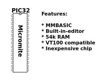 Micromite chip es realmente un PIC32MX150 o un PIC32MX170 (disponible de Microchip, Inc.) cargado con un código abierto especial "Micromite" software creado por Geoff Graham. Las virutas pueden obtenerse previamente programado con el software Micromite de Micromite.org. Incluso los miembros de los foros de Propellerpowered se han intensificando y ofreciendo chips programados para un dólar o dos sobre el costo. Si tienes un Pickit 3 programador, puede crear su propio usando los archivos .hex en la Página de Geoff.