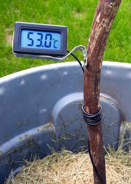 Opté por usar una rama seca de árbol caído porque son super abundantes, respetuoso del medio ambiente, y razonablemente baja conductividad térmica. Esto es bueno porque no desea que su memoria para llevar a cabo mucho calor hacia o desde la punta de la sonda del termómetro, esto aumentará la cantidad de tiempo necesario para obtener una lectura estable. Mi primer intento me tomó un minuto para la sonda a un pedazo de acero corrugado de cinta aislante, pero encontré que la varilla fue no sólo enfriar mi sonda, sino también mi pila de compost! El acero es aproximadamente 200 veces más conductora que la madera (54 vs 0.28).