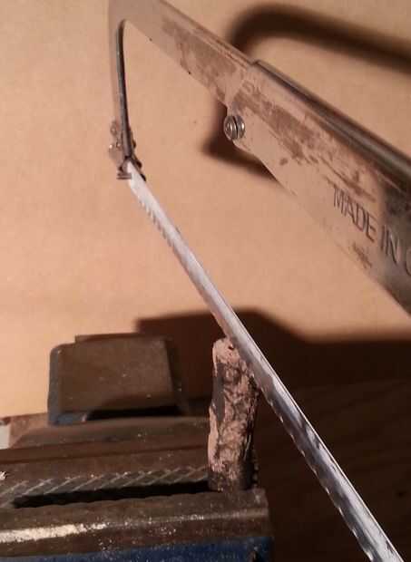 Levantar un poco la rama en el vicio y luego utilice la sierra para cortar a través del centro del agujero. Continuar el corte hasta que hayas cortado abajo cerca de 1,25 pulgadas (esto es 0,5 pulgadas más allá de la profundidad del taladro inicial). Elegí una sierra para metales porque tiene una hoja delgada y no borrar el agujero que sólo hemos perforado. Aún queremos los lados alrededor del agujero para estar presente para ayudar a sostener la sonda de temperatura en el lugar.