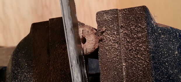 Afloje la mordaza para que apenas está asegurando la rama y gire la pieza de modo que usted puede cortar una cuña en un lado. Intencionalmente estamos haciendo el corte en un lado más amplio para que podemos ejecutar el cable de la sonda de temperatura abajo de él. Desea que la vice lo suficientemente apretada como para que impide que las dos mitades de la rama rompiendo o se mueva, pero no tan apretado que pellizca la cuchilla durante el corte. Podría intentar saltar, pero luego tendrás que quitar las dos mitades maneras para insertar el cable y puede partirse y la rama. Si sólo tratas de curiosos aparte, recomiendo hacer el corte inicial tal vez 2" a 3" (en vez de 1.25") profunda para reducir el riesgo de partir la rama. El lado negativo de hacer el corte inicial más profundo es que las mitades de dos rama no la sonda es tan apretado, pero usted podría intentar envolver alguna cinta alrededor las mitades corte firmemente una vez que se inserta la sonda.
