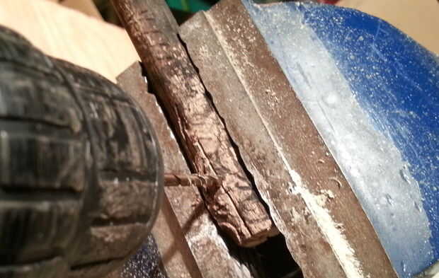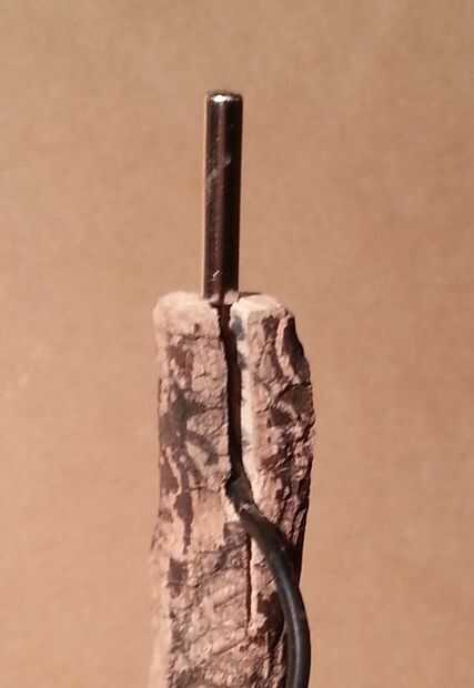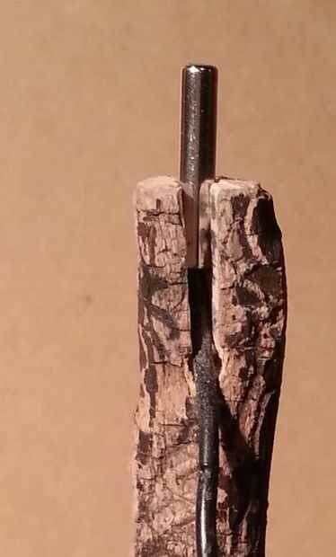 Apalanque las mitades de dos rama apartes y suavemente empuje la sonda hacia abajo en el primer orificio taladrado. Habrá cierta resistencia como el agujero es demasiado pequeño, pero esta fricción ayudará a mantener la punta de prueba seguro. Decidí dejar un poco más de la mitad de la punta de prueba expuestos para ayudar a aumentar la superficie de la sonda tocando el compost, pero encontrado que finalmente empujó mucho más en cuando intenté empujar duro abajo profundo en una pila de hierba compactada. Si te encuentras necesitando a empujar duro, utilizar un palillo diferente para hacer primero un agujero piloto en la pila de compost y luego vuelva a su termómetro de compost. Esto evitará que la punta de prueba empujando más la rama. También intenté cortar el extremo de la rama en un punto para ayudar a hacerlo más staby, pero sólo mejoraron las cosas un poco - hacer un agujero piloto.