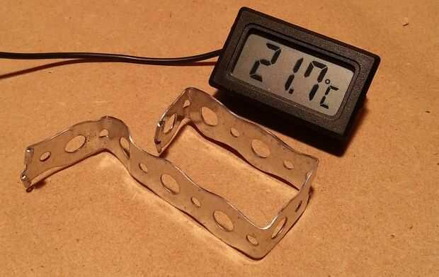 Usted podría hacer lo siguiente mucho más fácil con alguna cinta adhesiva, pegamento o lazos zip simplemente montar la pantalla a una pieza recta de fleje galvanizado. Decidí hacer una fricción apropiado para la pantalla por flexión el fleje galvanizado en la forma que se muestra a continuación porque pensaba que funcionaba bien, iba a durar mucho tiempo y facilita el estallar hacia fuera de la pantalla para cuando necesites cambiar la batería. Nota: mi termómetro lleva en más de un año así que no estoy seguro cuánto usted realmente necesitará cambiar la batería. Otra buena opción sería utilizar lazos zip liberable que son sorprendentes!