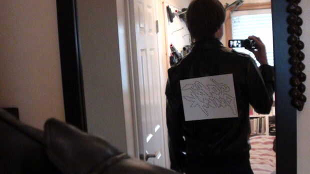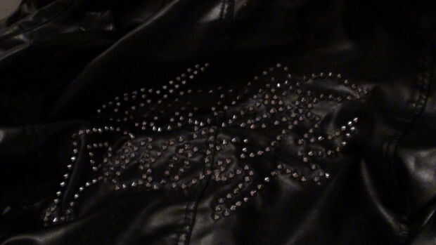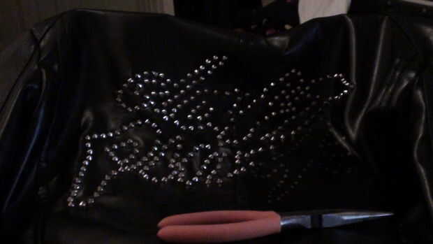 y puse una chaqueta de cuero falso $20 baratos que encontré en ebay.  Usé los alicates de punta doblar las puntas hacia fuera dentro de la chaqueta.
