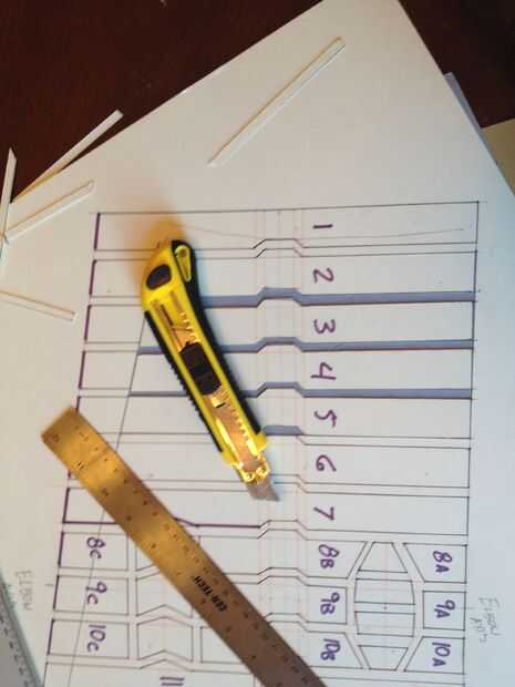 Para que tengas una plantilla para su brazo todo en cartulina - ahora utilice su cuchillo y una regla metálica para hacer cortes limpios, rectos. Como son corte, número de sus piezas para que sepas cómo reagruparlas. Usted también puede estar bien servido para cortar algunas piezas de la plantilla, ellos utilizan para cortar sus contrapartes de la espuma, a continuación, montar las contrapartes de espuma sobre la piel para que pueda ver cómo su idea de la plantilla funciona hacia fuera. Es mejor revisar su plantilla antes de que ha cortado su espuma en cintas para su trabajo final se ve y actúa de la manera que piensa que tener ningún material a la izquierda y un montón de pedazos de espuma inútiles no pueden hacer trabajo.