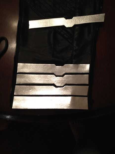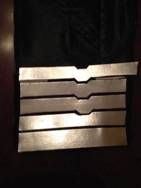 Cuando tienes 2-3 piezas de corte, iniciar montaje del brazo. Si usted es especialmente inteligente, que usted cortará unos 1/4"(6mm) tiras de tu espuma chatarra como separadores entre las piezas para asegurar un espaciamiento consistente. Coloque las piezas en su cuero de manera que puede marcar y recortar cualquier exceso de la caída antes de pegarlas hacia abajo.