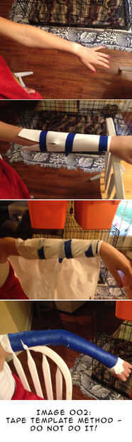 Arriba, imagen 001 te muestra lo que parece brazo de una chica adolescente normal. Nos estamos demostrando a usted para que pueda ver que no hay chicas adolescentes resultaron heridas en el traje de cosplay. Sin embargo, nosotros estamos también muestra a usted porque el método estándar para la construcción de armaduras cosplay es hacer una plantilla de cinta del brazo que está tratando de la armadura y utilice para construir el resto. Este método es muy difícil. Recomendamos que usted deje de usar que si usted está construyendo trajes de espuma para tus brazos.