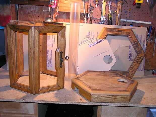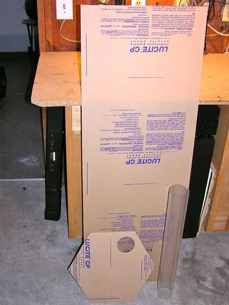 empecé con la tabla de extremo de roble y algunos hoja de acrílico de Home Depot. El tubo de acrílico vino de un negocio de venta por mayor de plásticos. Tener tanto el acrílico precortado como sea posible. Cuando necesite cortar acrílico, usar una sierra de calar con una hoja de plástico. También necesitarás un soplete de propano y un cloruro de metileno llamado solvente acrílico.