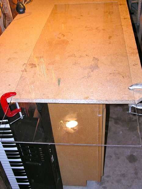 Sujete el acrílico por lo que la curva sólo sobresale por el borde del Banco y calor con un soplete de propano fijó a una llama media. Mantenga el soplete moviéndose! Quiere suavizar el acrílico pero no fundirlo. Si ve burbujas, o si queda un lick de llama cuando se mueve la antorcha, entonces usted está recibiendo el material demasiado caliente.
