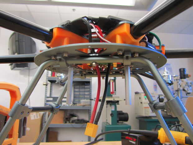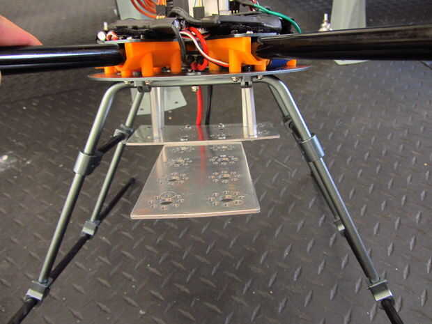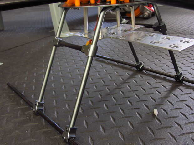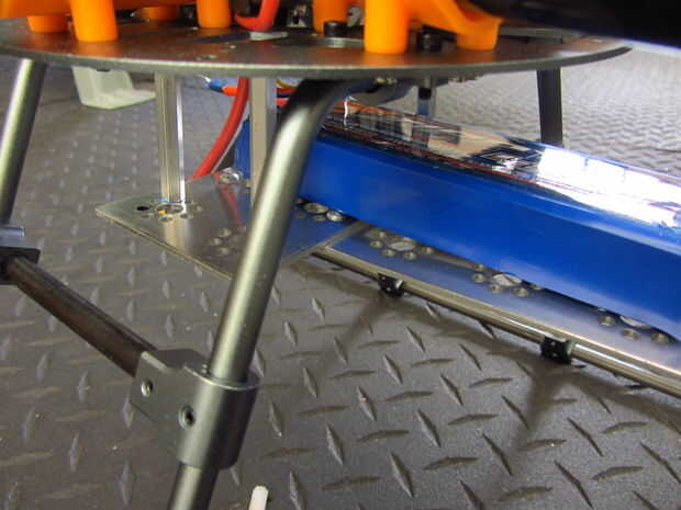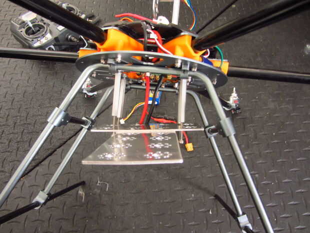 - Decidí usar un perfil de forma de T para la construcción. Hay 8 agujeros en el soporte inferior que la placa puede conectarse, escogí el 4 que alinean con los patines de aterrizaje.