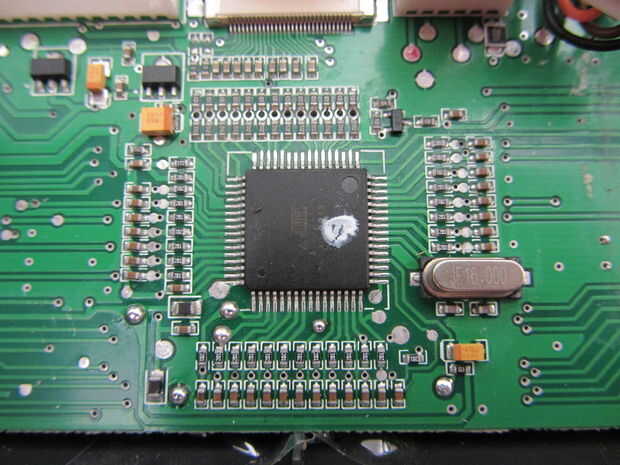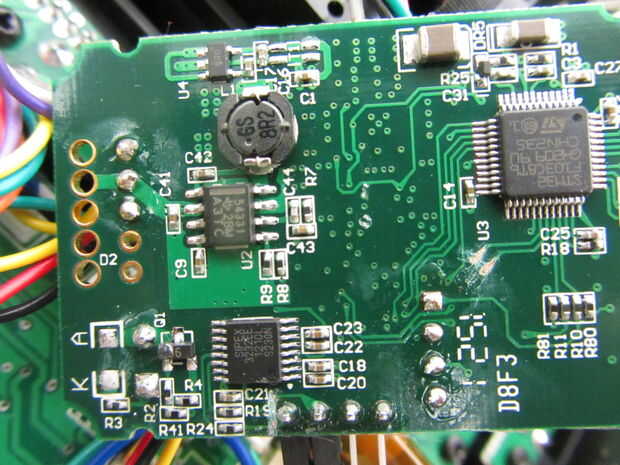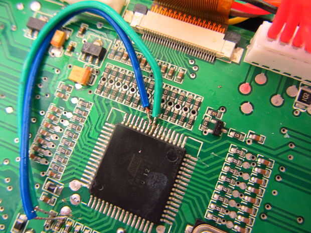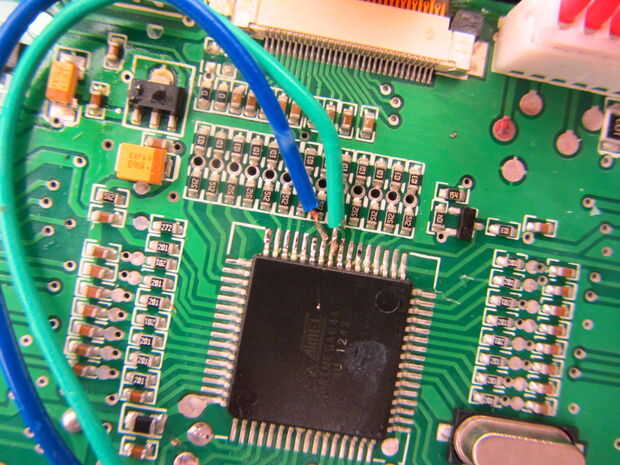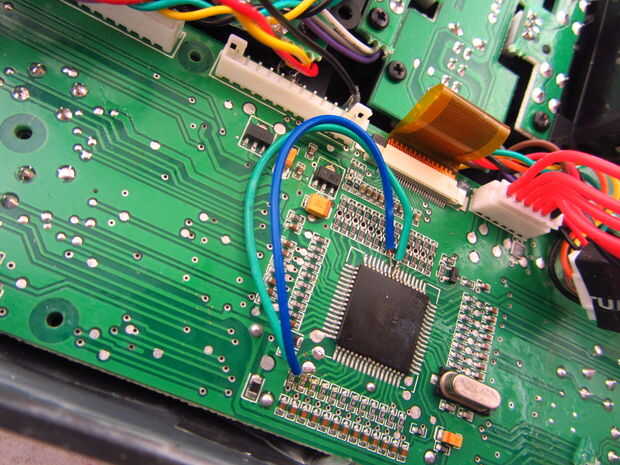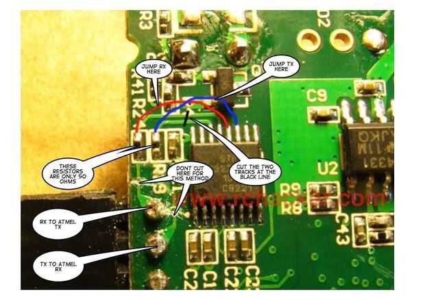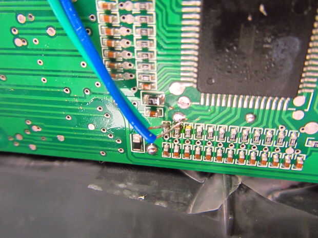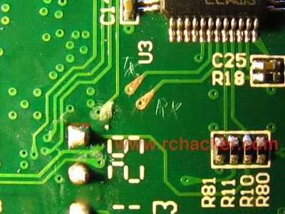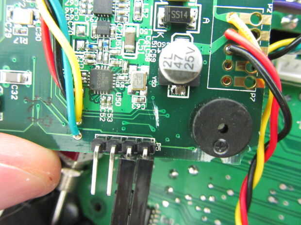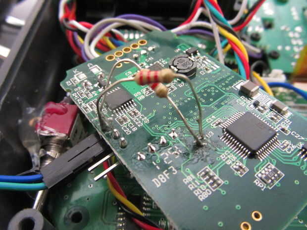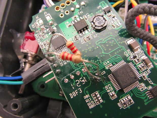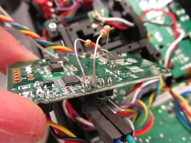 - Vas a cortar dos cables en el Turnigy 9 x controlador de Junta. Hay un pad conectado a una resistencia (segundo desde la izquierda en la fila de resistencias) cortar allí. Use un cuchillo de la manía para cortar el cable.