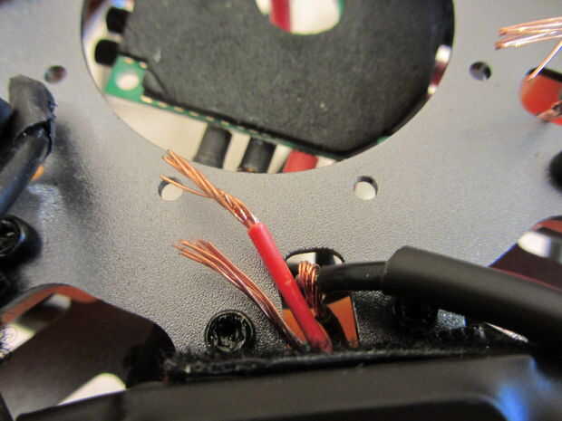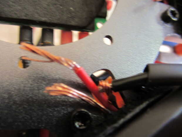 - Serpiente el cable de conexión a través de los cables del hueco motor. Hay ranuras justo encima de donde están los soportes de plástico naranja, con unas pinzas, pellizcar los cables y tire de ellas a través de las ranuras. Hacer esto para todos los 6 lados.