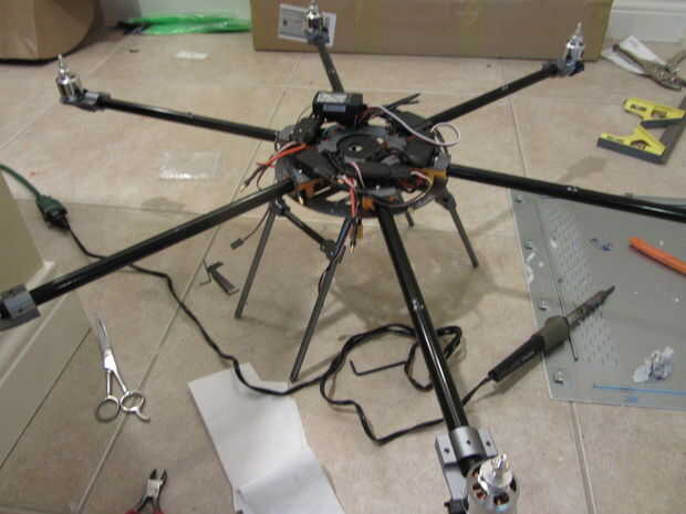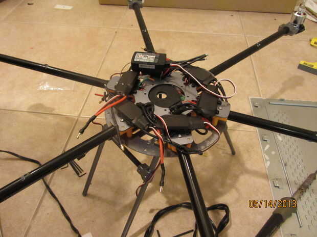 - Enchufe el cable de salida para el motor marcado con "8" al canal 3 del receptor (Si utilizas mi configuración debe ser la salida a la derecha de ese brazo del motor). Asegúrese de que el cable blanco en la ESC enfrenta a la etiqueta en el receptor. Luego mantenga pulsado el botón bind en el transmisor y conectar una batería LIPO a la Junta dist.. Suelte el botón bind y el transmisor y el receptor deben ser atados!