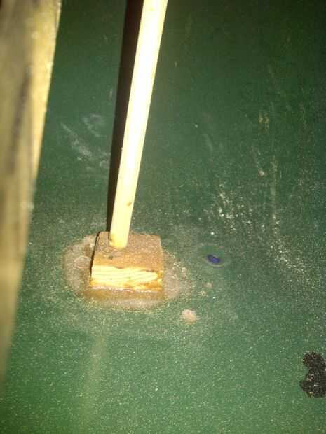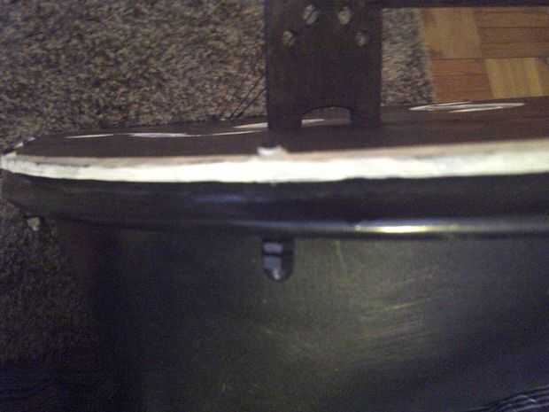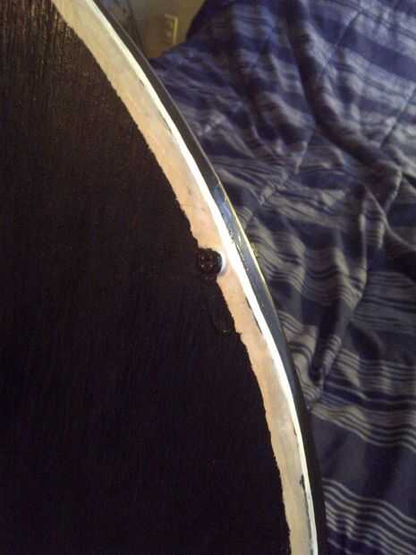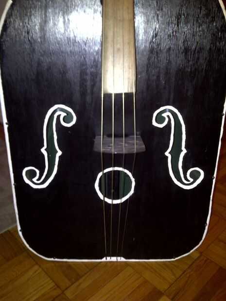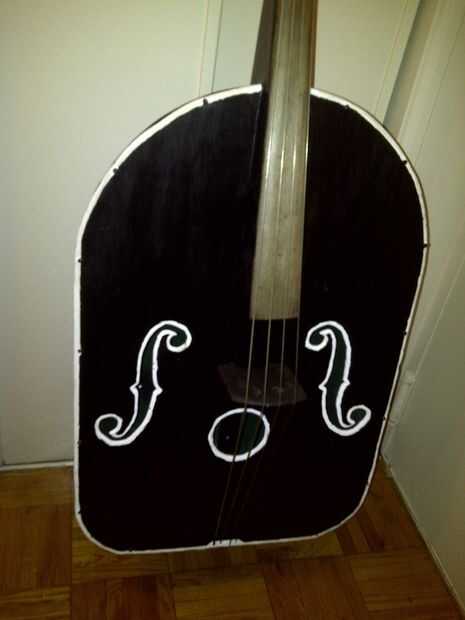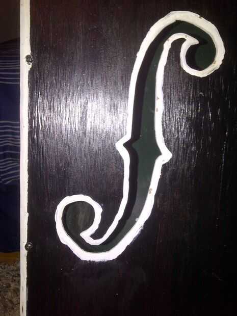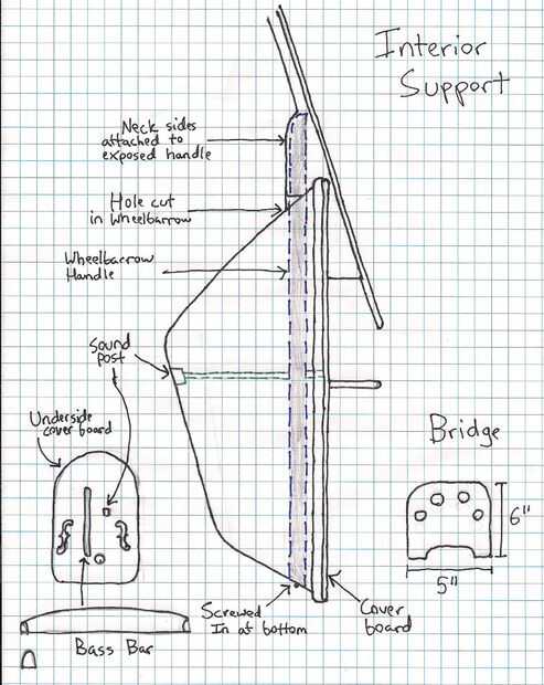 Después de hacer un poco (poco hincapié) investigación sobre las partes de un bajo vertical, hice una barra baja y un mensaje de sonido. La barra baja se une a la parte inferior de la cara, pasando aproximadamente por debajo de la cuerda E. Es sobre una franja de 2 pies de madera 3/4" ancho, cónico por lo va de aproximadamente 1/2" de alto a cada lado a unos 1 1/2" en el centro. Usé una escofina de madera a la parte superior de la barra baja. El sonido es un 1/2" espiga de madera que se extiende desde la parte inferior de la cara cerca de Tanga en la parte posterior de la carretilla.