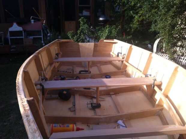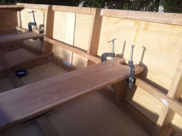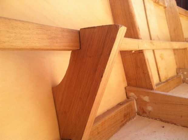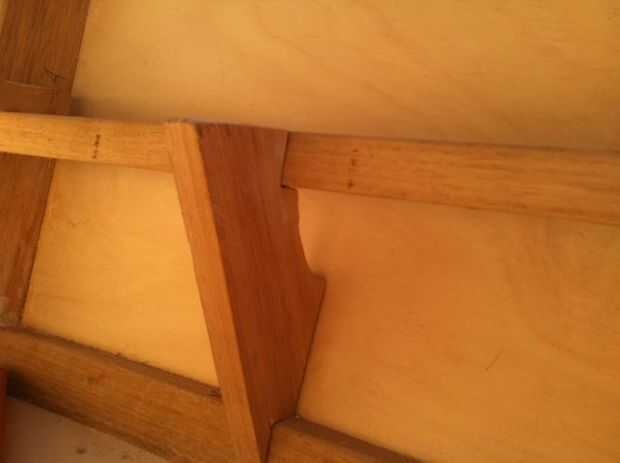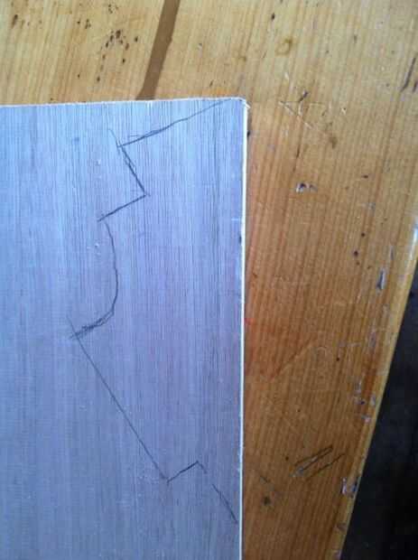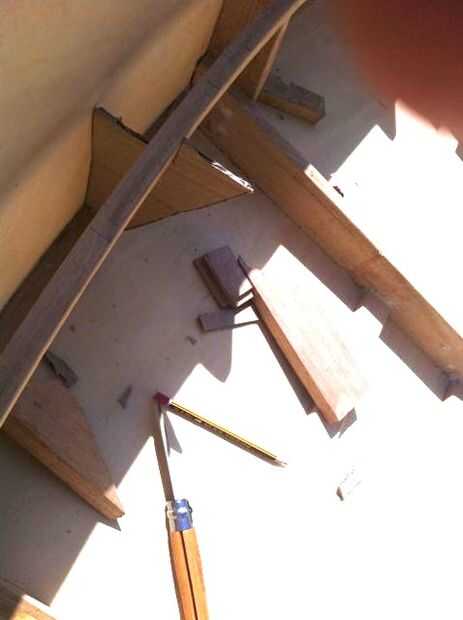 Mi última pieza de madera fue dos piezas en forma de v de ply - uno por cada lado del centro de la claraboya para hacerla más fuerte y más grueso para apoyar un tablero a motor. Tuve que cortarlo por lo circundó el talón entre la quilla y espejo de popa.