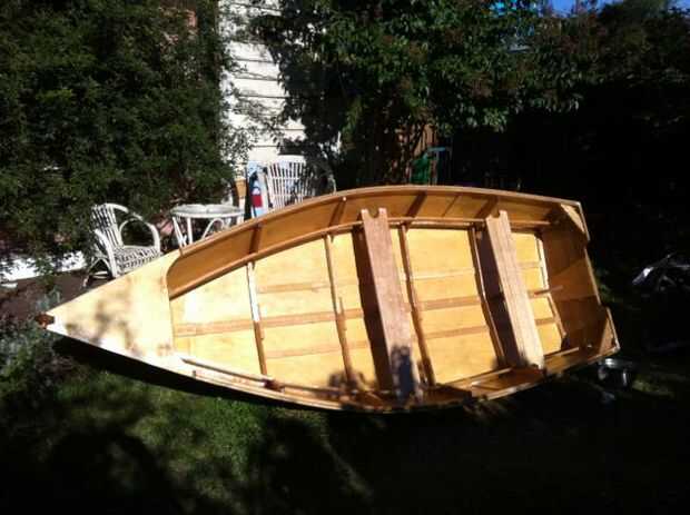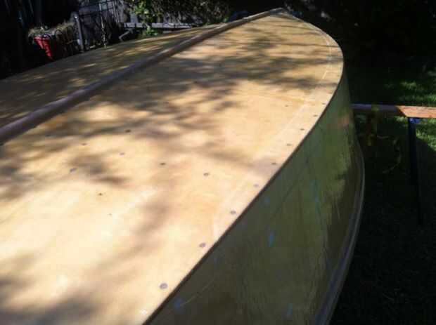 Con el barco boca abajo... En la parte inferior del casco me aplique una capa de fibra de vidrio mate y recortado por lo que fue 'hasta' los lados 50 mm todo. También tuve alguna cinta de fibra de vidrio que apliqué a los bordes / esquinas y el vástago.