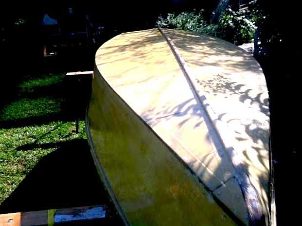 La resina de epoxy se mezcló y se aplica con pinceles y rodillos para el entero fuera del casco. Tardé unos 20 minutos para obtener el vidrio saturado hasta que transparente. La resina comenzó a apagarse después de 30 minutos. Por la mañana era difícil... (ufff)