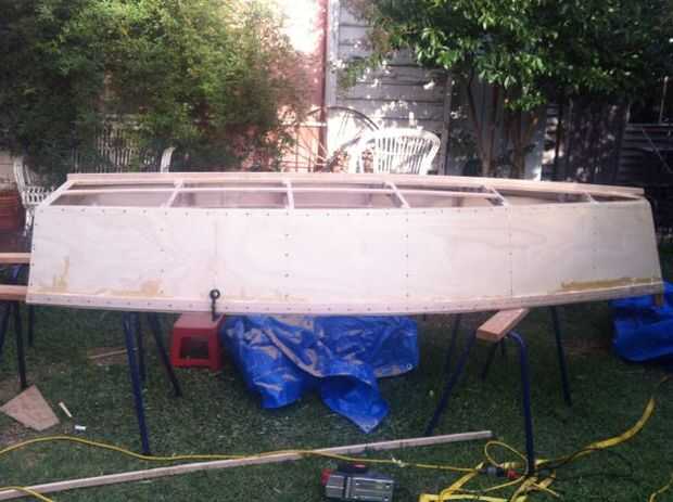 Después de que los lados de cartón del tamaño completo simulado hasta los lados de la estructura del barco trazado les en las hojas de capa más 10 mm alrededor de peligro.... Una unión era necesaria hacia la popa y usé un rectángulo de contrachapado en la parte interior de la Unión a apoyar. Este rectángulo fue un ajuste limpio entre la máquina y el inwale y puesto, sujeta al mismo tiempo que los paneles fueron sucediendo.