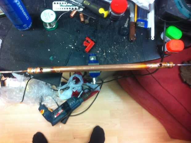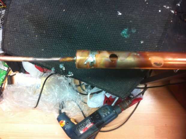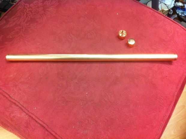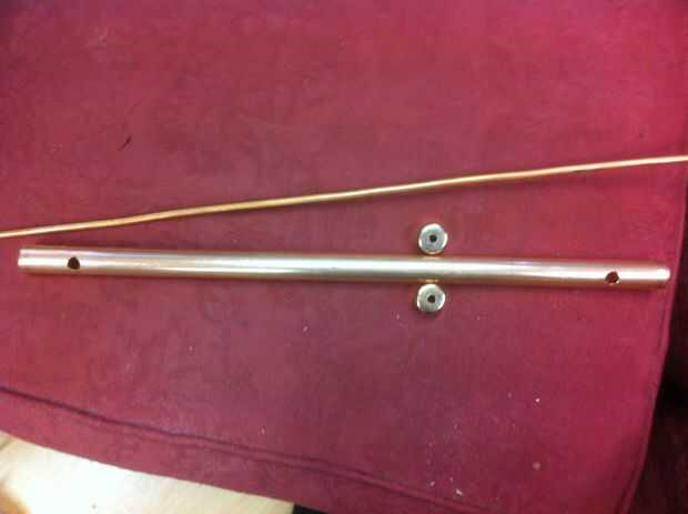 Taladre un agujero de 6mm en el centro de cada tapa y desglosar 2 agujeros en el lado de la tubería de cobre de 22mm aproximadamente 1,5 pulgadas de cada extremo.