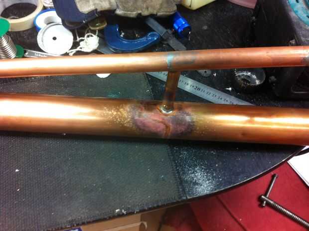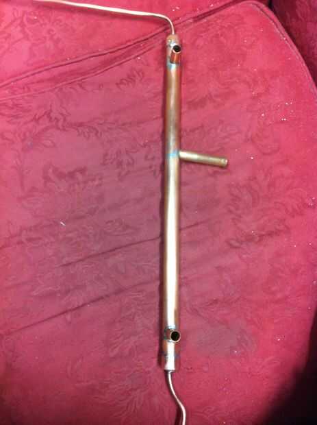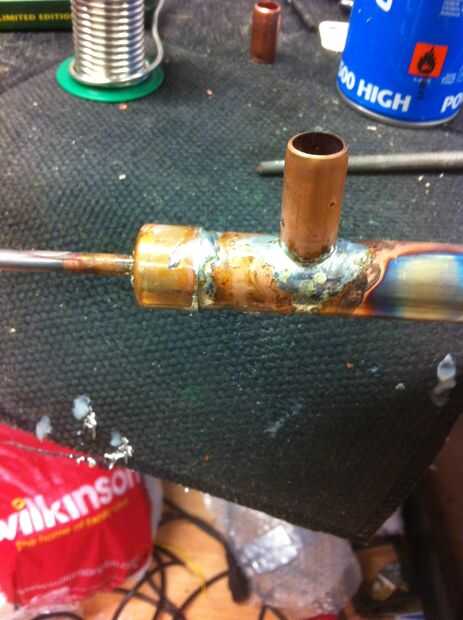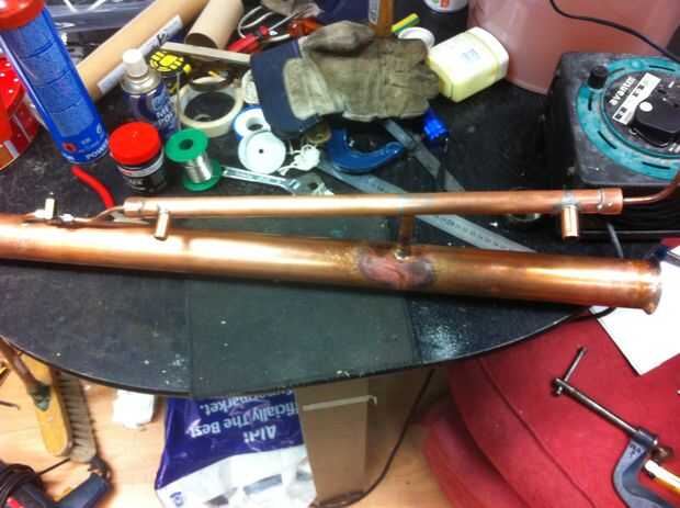 Corte una longitud de 75cm de tubo de 6mm y empuje a través de las tapas para que tenga unos 10cm que sobresale de una final y soldar en su lugar, usted necesita para asegurarse de que las articulaciones son herméticos al agua como va a correr agua por Liebig para enfriar el tubo de 6mm que a su vez volverá a enfriar el líquido que pasa a través de él , esto es sorprendentemente eficaz.