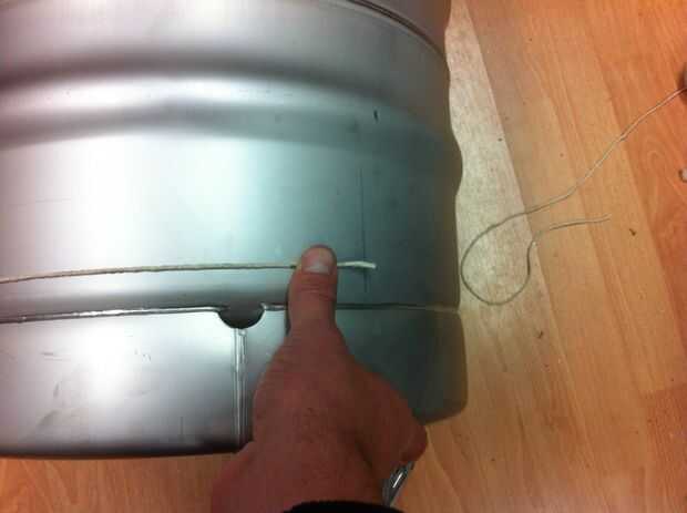 usando un borde recto, idealmente una plaza, Mida hacia abajo desde el mango y hacer un lápiz de marcar, y luego rodar el barril y hacer otra marca abajo de la otra manija, ambos deben estar en la parte inferior del barril.