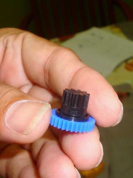 Lugar de eso, P9 en el engranaje de P7/P6. Luego, coloque otra P6 en el orificio superficial y poner la P4 en el segundo eje. Después de eso, poner otro P4 sobre el engranaje combinado (P7/P6). Por último, poner P5 (marrón en la parte superior la primera P4 (gris). (no el ensamble del engranaje combinado)