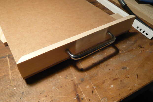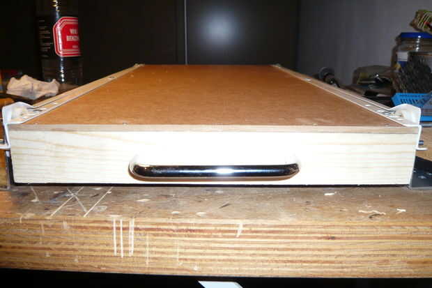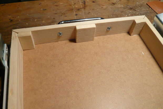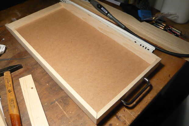 Como se puede ver en la última foto, he decidido montar tres pequeños trozos de madera contra la parte delantera del cajón. Esto es debido a la ventilación y para poder sacar su ordenador portátil más fácil.