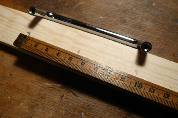 Después de montar el mango, es hora de marcar los agujeros que tienen a ser taladrados para los tornillos que sostienen los corredores y los agujeros para los clavos que refuerzan la conexión entre los lados y la parte inferior del cajón (Foto 5.6.7). Perforé a través de los agujeros el mdf y los listones porque no quería que cualquiera de ellos para desgarrar cuando hacia abajo de las uñas.