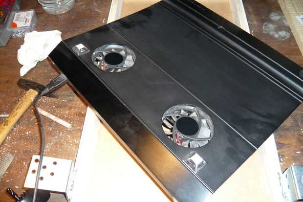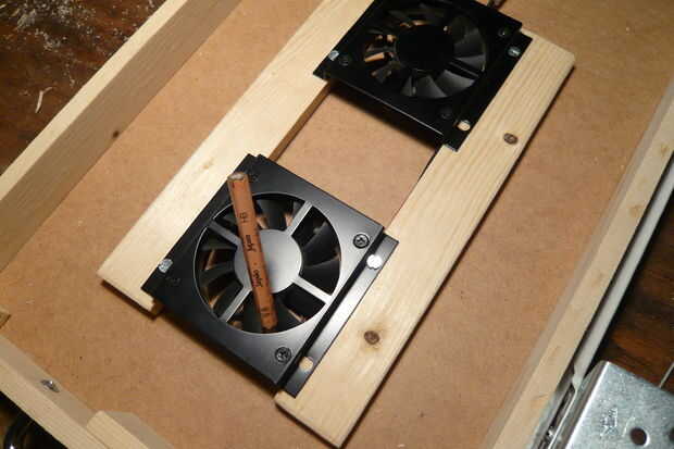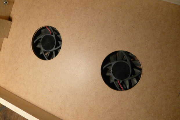 Después de montar los ventiladores en el cajón, utilicé una broca pequeña y una sierras de marquetería para hacer el agujero para el conector usb y encendido/apagado.