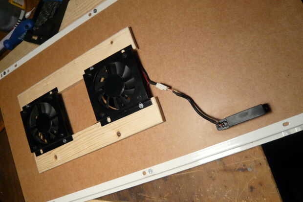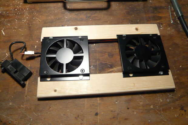 Pero dejar que la computadora portátil a respirar tranquilos y darle algún extra de enfriamiento, he decidido construir en un laptopcooler que usé en mi escritorio antes (Foto 3).