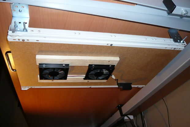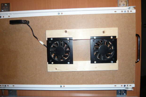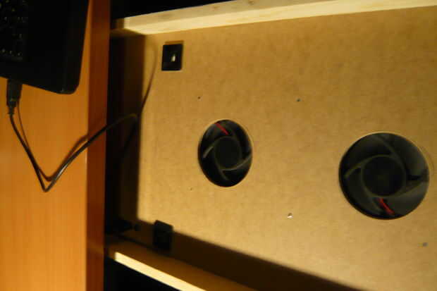 Después de montar el cajón y conectar mi portátil, me di cuenta de que el espacio entre la madera y la laptop sería muy poco para un flujo de aire decente. Por eso he añadido 4 tapas de negro directamente en el lugar donde las tapas de goma debajo de mi laptop son (foto 7).