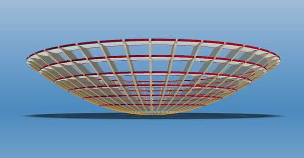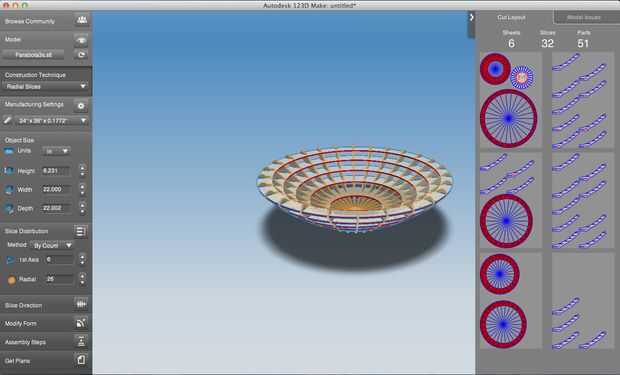123D make le permite convertir su forma 3d en un entramado de perfiles 2d que pueden cortar y montar juntos. Después de importar mi forma, escala para el tamaño más grande que pude hacer en mi cortador del laser y elegí un patrón de corte radial. Elegí la dirección sector centro desde el plato (como radios) y hacia arriba como los anillos. 123D make calcula automáticamente los perfiles necesitaba para el entramado y agrega las ranuras de modo que cada pieza se desliza en el lugar correcto.