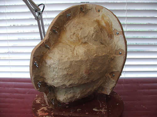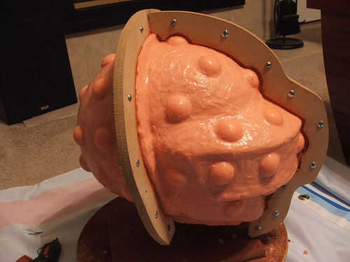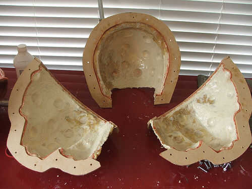 Para mi molde, he decidido hacer separaciones utilizando MDF de 1/4" para dividir la chaqueta del molde en tres partes. Con una forma compleja como un casco, una chaqueta de molde de una sola pieza o dos piezas incluso sería difícil de eliminar. Taladro alineados los orificios en los tabiques MDF, luego unirlos con wingnuts antes de aplicar la chaqueta del molde. (foto 2)