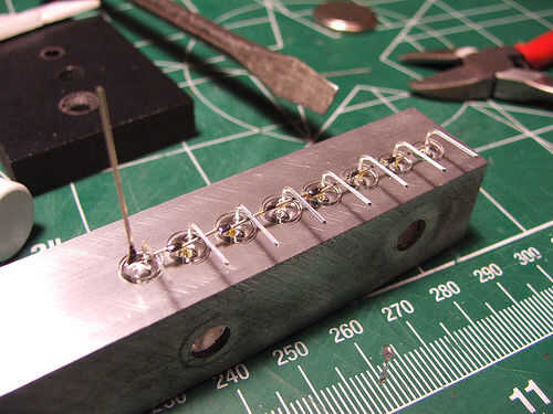 Una vez que se recortan las puntas, hacer una plantilla nueva de cualquier material de desecho que tienes que es plana por un lado, por lo menos 0.5 "x. 5" x 0,3"- utilicé tubo cuadrado de aluminio. 8 perforaciones en una línea el espacio mismo exacto en su visera de sub de PET. (foto 3)