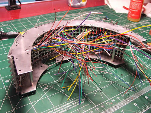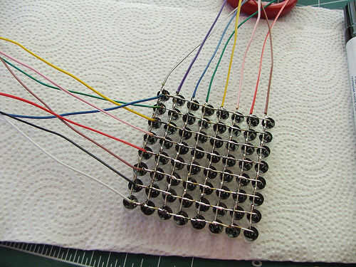 Una vez soldado, puede quitar los LEDs de la subvisor presionando ligeramente en el frente de ellos. Desmontar las unidades de 8 x 8 y la soldadura de las conexiones a las filas y columnas. Mantenga el cableado ordenado y tratar de ejecutar las líneas de un lado de la pantalla - usando calor tubería de encogimiento puede ayudar a hacer cosas de seguro ruta la manera correcta. (fotos 7 y 8)