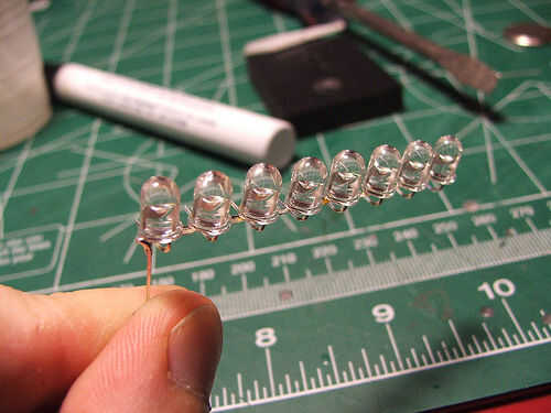 Lugar 7 LEDs con 2 cables doblados y uno de los LEDs con una inclinación conducen en los agujeros perforados y soldar los conectores de los cables de más bajo-sentándose juntos. Cuando haya terminado, debe tener una línea de LEDs con los ánodos soldados juntos y un recto plomo al final. Repita esto para tantas columnas que tengas en tu matriz (para mí, era 40) su una buena idea en este momento para pintar las espaldas de la venida de LEDs negros para evitar la luz en el casco mientras que usted está usando. Esperé hasta más tarde y era un poco de un dolor hacerlo. (foto 4)
