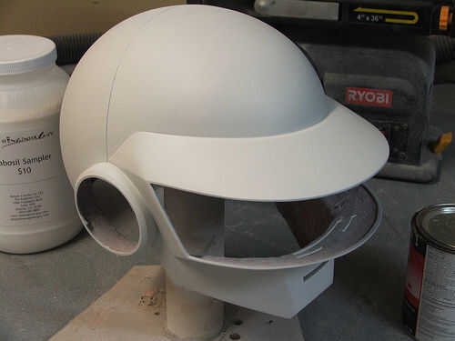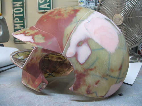 El proceso para la preparación de un bastidor del casco es muy similar a cómo se preparó el maestro esculpir para moldear antes. Después la tiró de una parte del reparto, rociarlo con la cartilla para revelar cualquier abolladuras o imperfecciones en la superficie de plástico fundido. Rellenar con una capa de bondo u otro relleno de resina de poliéster. (foto 2)