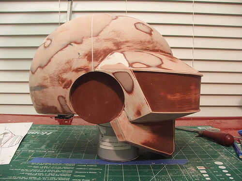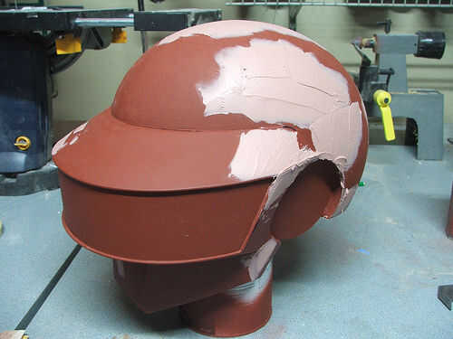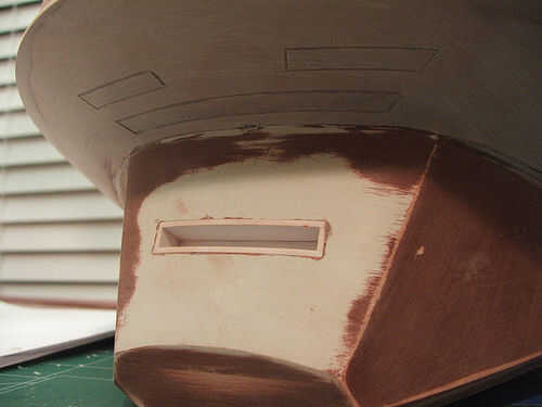 La "boca" del casco es una caja de sangría. Mida la abertura de sus planos y crear un. 5" de profundidad de la caja de. 1" plástico de estireno. Usé una broca de taladro para abrir un área en la parte delantera del casco para que ajuste, pero una herramienta giratoria dremel funcionaría igual de bien. Integrar el cuadro de boca en el casco, luego rellenar los huecos con bondo y lijar al ras. (foto 4)