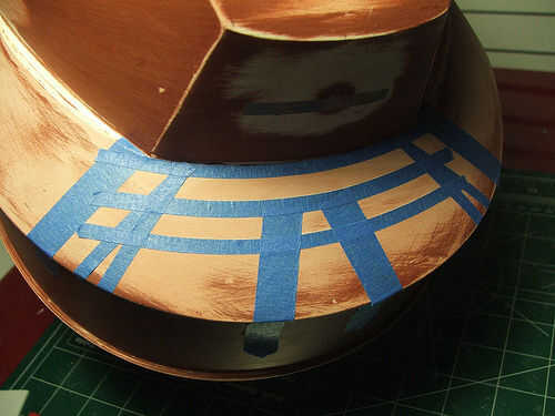 Puede tratar los orificios de la visera baja la misma manera con la construcción de cajas de estireno o marque las líneas como lo he hecho. Sería mejor que lo han hecho en sus planos antes (se me olvidó!) pero algunas matemáticas y un calibrador del dial hará bien si no dar este paso al principio. Cuando trazando líneas, a menudo fáciles de establecer una franja de la cinta primero para utilizar como guía. (foto 5)