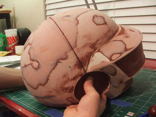 La línea de costura en la parte superior del casco es mejor bosquejada hacia fuera usando un trozo de cuerda. Si usted tiene un asistente, tienen mantener la cadena en la parte superior de las orejas mientras traza la línea de la cadena hace. Si no tienes un ayudante, una línea de tiza o cuerda frotada con grafito funcionará también. Después de esta línea se dibuja, hacerse con un conjunto de archivos de mano, herramienta dremel o un cincel de grabado. (foto 6)