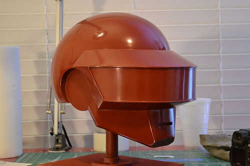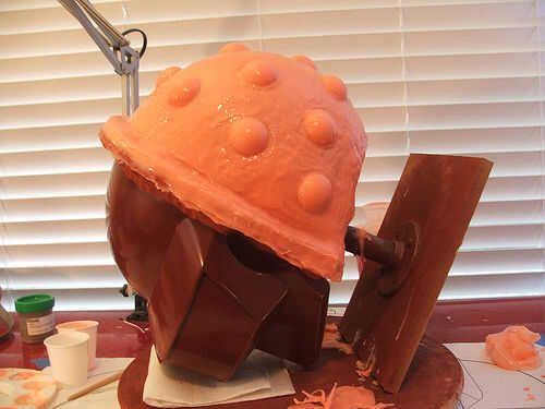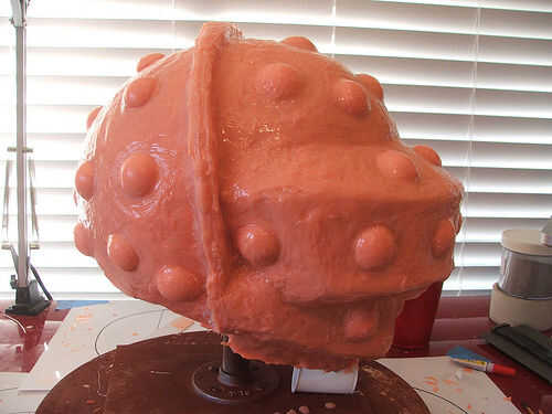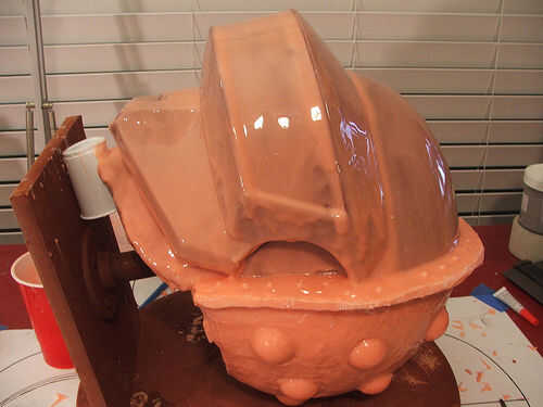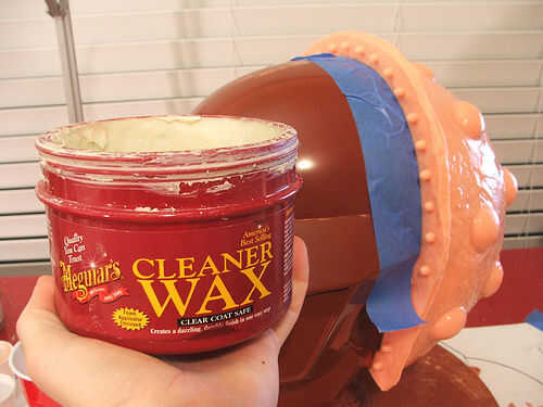 Una vez completada la mitad posterior del molde, repita el proceso para la parte delantera del casco. Quite la pared separando las dos mitades del molde y pincelar con cera de liberación de molde o un producto similar. Use cera de caranuba de Meguiar, pero tenga cuidado, ya que esta cera disolverá la cartilla de Krylon en la escultura principal. Una vez que la silicona posterior ha sido encerada, pasemos al moldear la mitad delantera del casco.