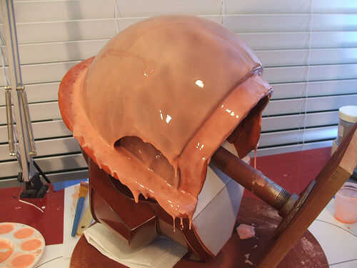 Este casco, decidí hacer un molde en 2 partes. La línea de costura se sentaría en la línea de costura labrada a lo largo de la cresta superior del casco. La marca de la costura con la arcilla no azufre aceite, asegúrese de agregar claves de registro en la superficie de la otra mitad del molde. Empieza con una capa adelgazada, construyendo poco a poco grueso hasta que hayas llegado a. 25" a. 5" de silicona alrededor de toda la sección. Para este molde del casco, silicona de rebote-25 fue utilizado. (foto 4)