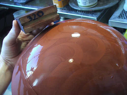 Después de que esté completamente seca la imprimación, comienzan a wetsand el casco. Empezar con lija esponjas (grano 320 o 400) y luego trabajar en grano de la lija de 600, 1000 y 2000. Utilizando poco windex o plato de jabón en el proceso de wetsanding hará su papel de lija dura más tiempo y producir resultados más suaves. (foto 2)