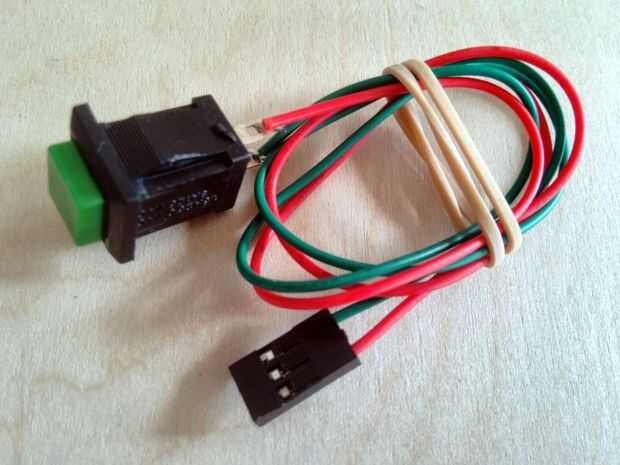 Normalmente, querrá poder por su piCentr a través de la interfaz en la TV (usando el mando a distancia) en lugar de simplemente desenchufándolo. Para encender, a instalar un interruptor de botón pulsador momentáneo en la parte frontal del dispositivo, que se conecta al conector GPIO del Raspberry Pi para volver a despertar el procesador. El interruptor de encendido debe ser por cable a aproximadamente 20cm de alambre y terminado en dos conectores hembra de solo-perno o en el exteriores dos ranuras de un conector estándar de 3 pines de berg como se muestra.