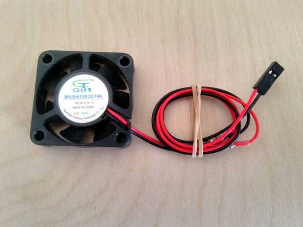 Para mantener la frambuesa Pi 2 y cool de unidades de disco duro, puede instalar un ventilador cuadrado de 40 mm en la parte posterior de la caja (Asegúrese de que es un ventilador de 5V, no la más común de 12 voltios). El ventilador deberá ser terminado en un conector hembra de solo dos pines berg y por cable a aproximadamente 20cm de alambre.