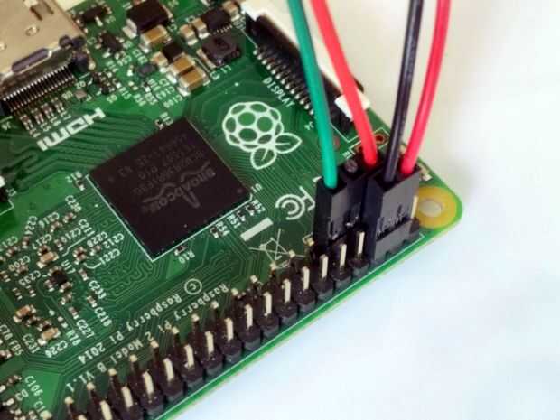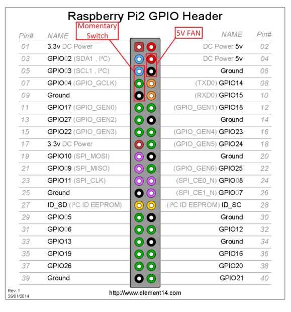 Conecte el ventilador a los pines 4 y 6 (5V y tierra, respectivamente) de la cabecera GPIO y el interruptor momentáneo a los pines 5 y 9 como se muestra. Tenga en cuenta que no hay conexión al pin 7 del encabezado GPIO - el objetivo del interruptor es momentáneamente conector de tierra 5, que es lo que despierta el Raspberry Pi.